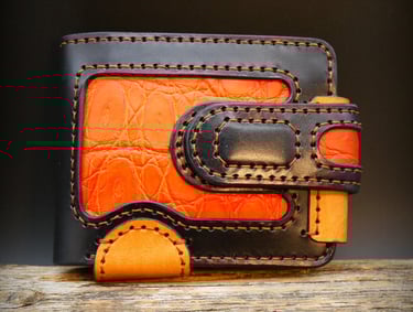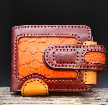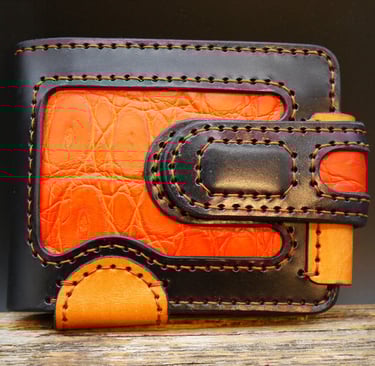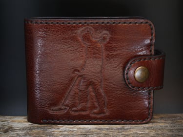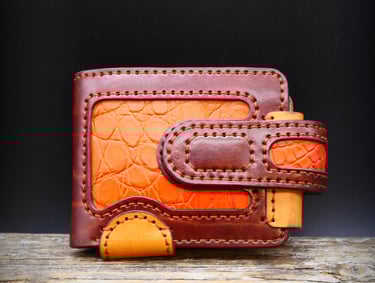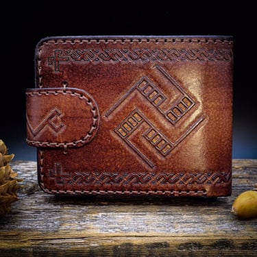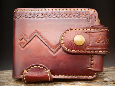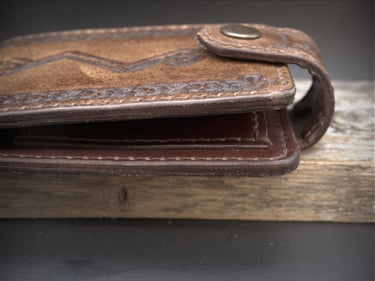 Rankų darbo natūralios odos piniginės iš arti.
